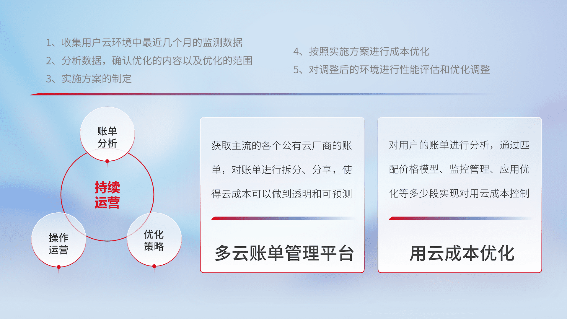 通过多云纳管,,,以统一的资源数据模型把客户的云资源进行抽象和封装,,进而实现对多云资源的统一操作,,,,保障云资源管理的可靠性、、、稳定性与可用性。。量身定制化运维内容,,,配置、、、、开发运维、、、、补丁管理、、备份、、监控、、、、认证和访问管理、、、、审计和日常巡检等,,,,保障在用云过程中的可靠度,,,稳定度以及高可用率。。。。